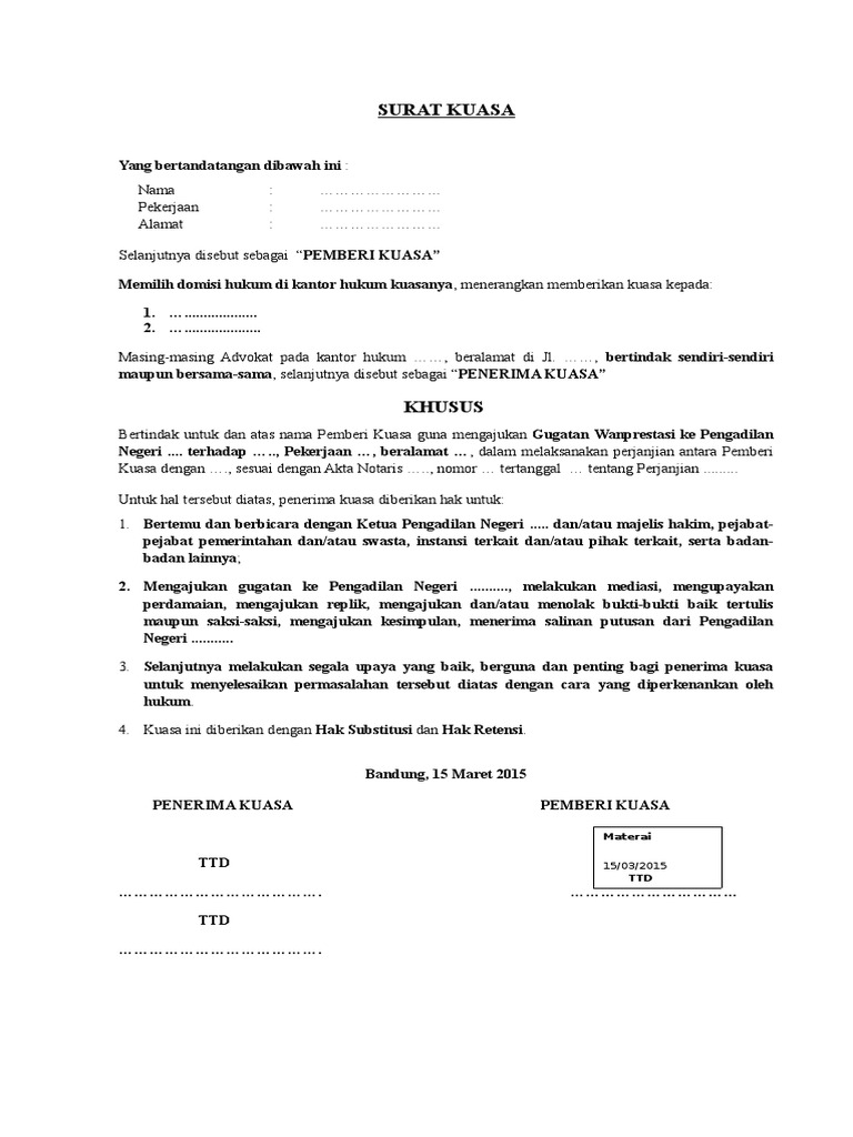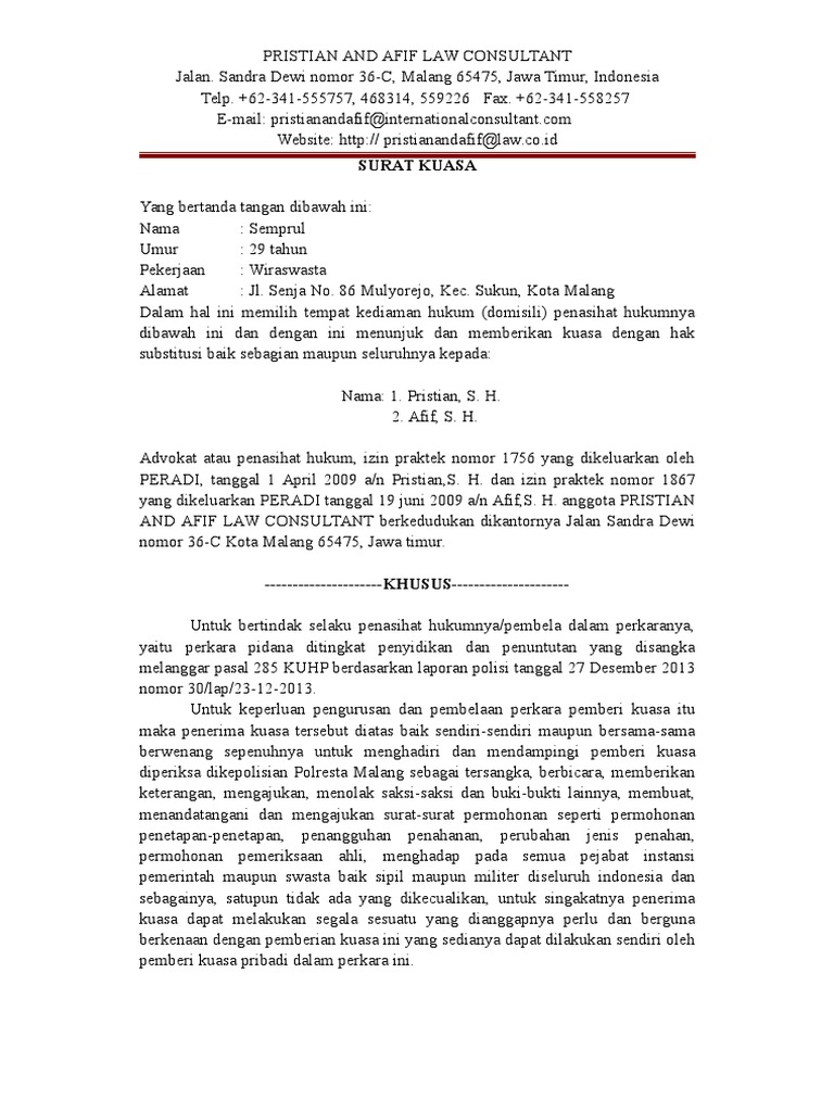 Contoh surat kuasa khusus perkara perdata perbuatan melawan hukum pmh surat kuasa. Jika masih ada yang belum, pada kesempatan kali ini kita akan mengulas lebih dalam lagi mengenai surat kuasa. Yang bertandatangan dibawah ini semuanya perkerjaanya advokat, berkedudukan dan berkantor di jalan semolowaru no. Selanjutnya penerima kuasa berhak mendampingi pemberi kuasa selama pemeriksaan tingkat penyidikan. Surat kuasa perseorangan adalah surat yang dibuat oleh seseorang kepada orang lain yang dipercayainya untuk melakukan suatu hal guna untuk kepentingan pribadi orang yang memberi kuasa.