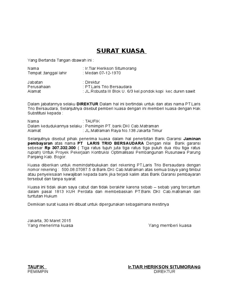 Contoh surat kuasa pengambilan uang contoh surat kuasa yang baik dan benar Surat kuasa pengambilan bpkb di bank, bca finance, bri, bni dll. Contoh surat kuasa pengambilan uang di bank. Maka silahkan kalian download contoh surat kuasa jika sudah download contoh surat kuasa pengambilan bpkb yang berformat.doc dan.pdf diatas. Jika anda membeli motor dengan cara mencicil, maka tentu bpkb tidak akan diberikan selama motor cicilan anda belum lunas.